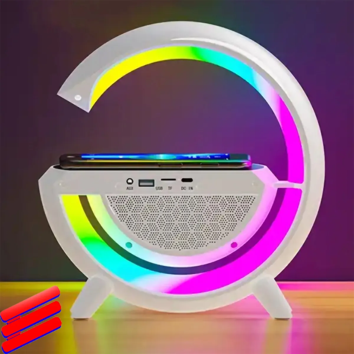 Cuenta con Cargador inalámbrico multifuncional + Altavoz Bluetooth + Lampara luces rgb + contesta llamadas + radio